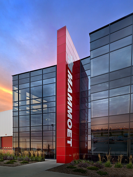 Mammoet Canada Western’s head office is located on a 45-acre property in Edmonton, Alberta. The 75,000 square foot facility is home to a 30,000 square foot, three-storey concrete office building and an extensive 54 foot high maintenance shop. Within the maintenance shop are five overhead cranes: two 35 ton, two 15-ton, and one 10-ton. The property also features green technologies, including a large geothermal system powering the in-floor heating and office heating systems. This turn-key development was completed and turned over to the client in July 2009.